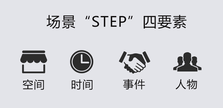 通過上面的例子,大家都有了個(gè)大致印象。那么接下來講講什么是場(chǎng)景?一般認(rèn)為場(chǎng)景是指在特定的時(shí)間、特定的空間內(nèi),發(fā)生的人與人之間關(guān)系的集合。這其中包含四個(gè)要素:時(shí)間(Time)、空間(Space)、人物(People)、事件(Event)。