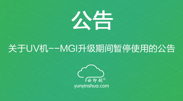 ? ? ? 您好!云印刷生產(chǎn)中心的數(shù)碼UV機(jī)-MGI將于2017年11月20日14:00起至2017年11月27日進(jìn)行軟件系統(tǒng)和硬件設(shè)備升級(jí),升級(jí)期間將暫停使用。在此期間所下訂單延后至11月28日統(tǒng)一安排生產(chǎn),屆時(shí)可能造成短暫的發(fā)貨滯后現(xiàn)象,如給您造成不便敬請(qǐng)諒解!