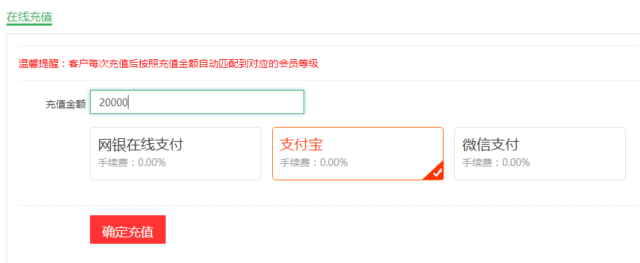 第三步:在充值頁面輸入要充值的金額,選擇支付方式后點(diǎn)擊“確定充值”按鈕跳轉(zhuǎn)到對(duì)應(yīng)的支付充值頁面。